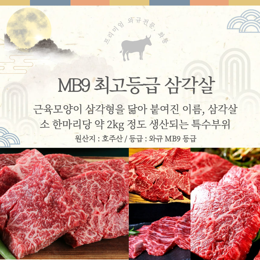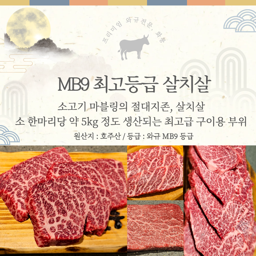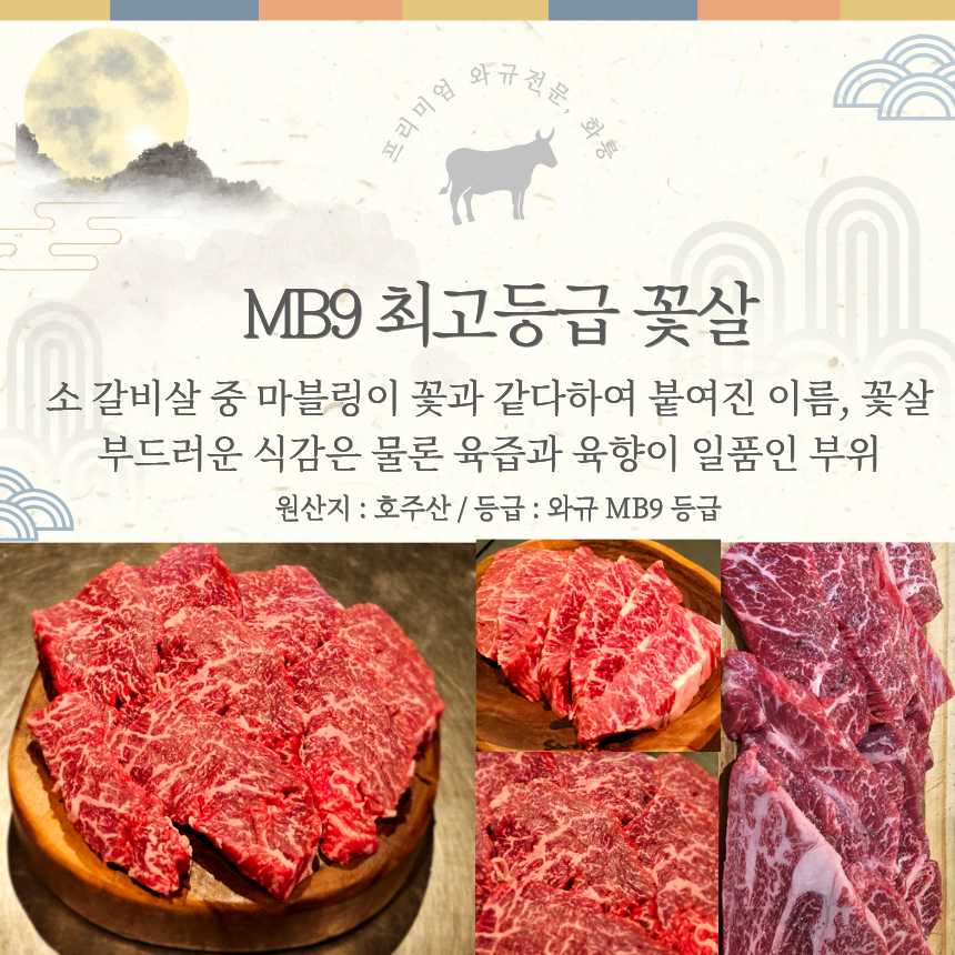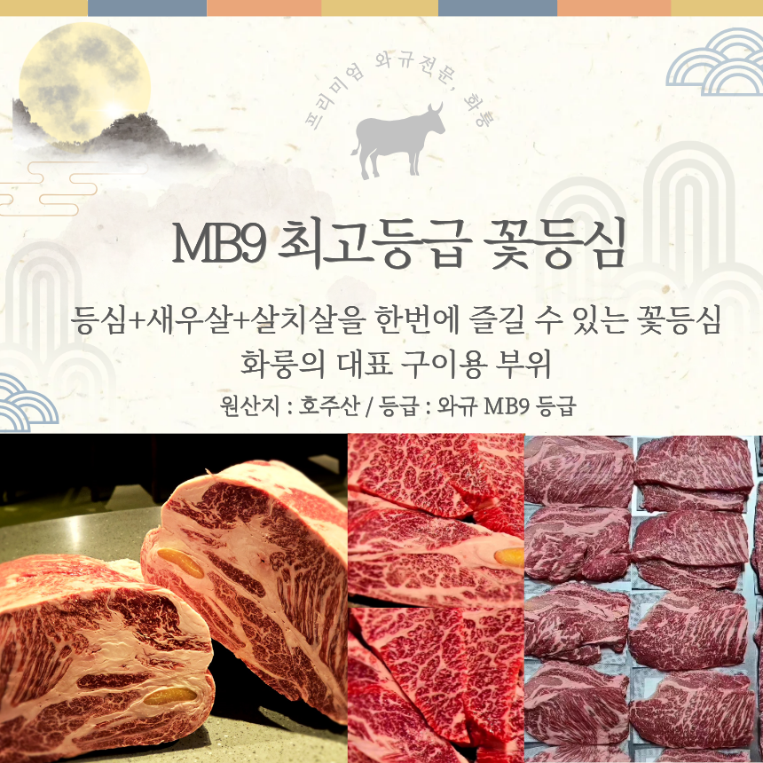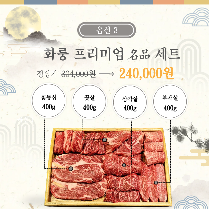 화룽 프라임 명품 세트 1.2kg (MB9고마블) 등심/꽃살/부채/삼각/살치/눈꽃살(소금1,와사비2)